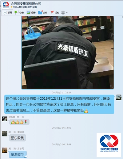 因为拍摄的是下属企业员工,领导看着这印有LOGO的武装押运制服感觉很亲切,只默默的会心一笑,并没有打扰这位正在看书的押运员,而是把图片发给了保安集团董事长应长春。